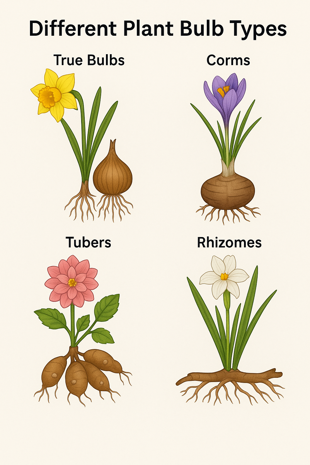There are 4 different types of plant bulb, namely True Bulbs, Corms, Tubers and Rhizomes. Although they are not the same in appearance all bulbs store food for the plant and have roots to anchor the plant and absorb water and nutrients from the soil.